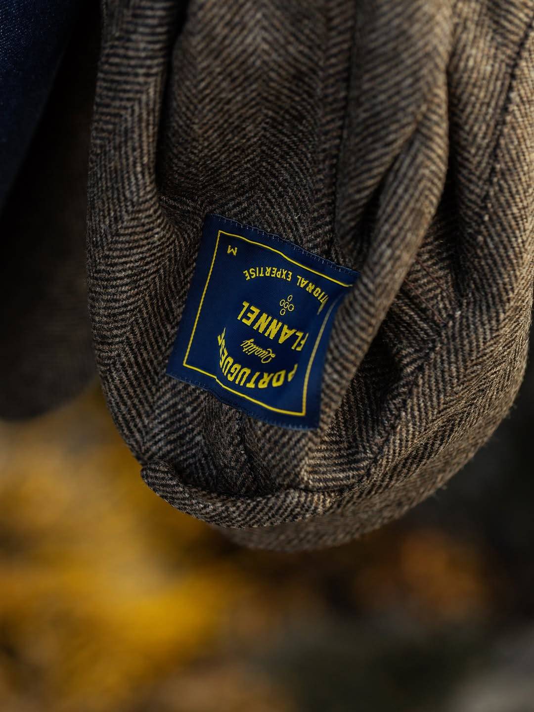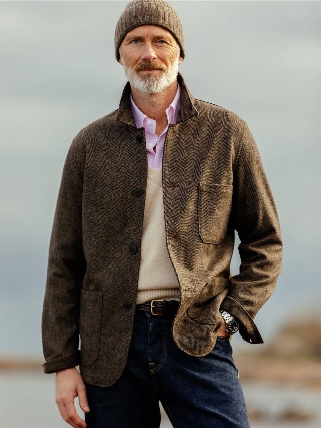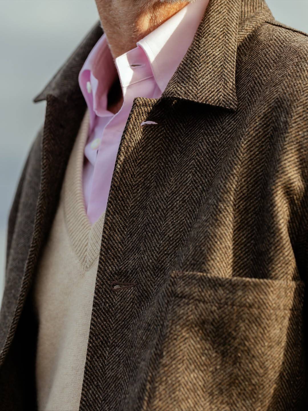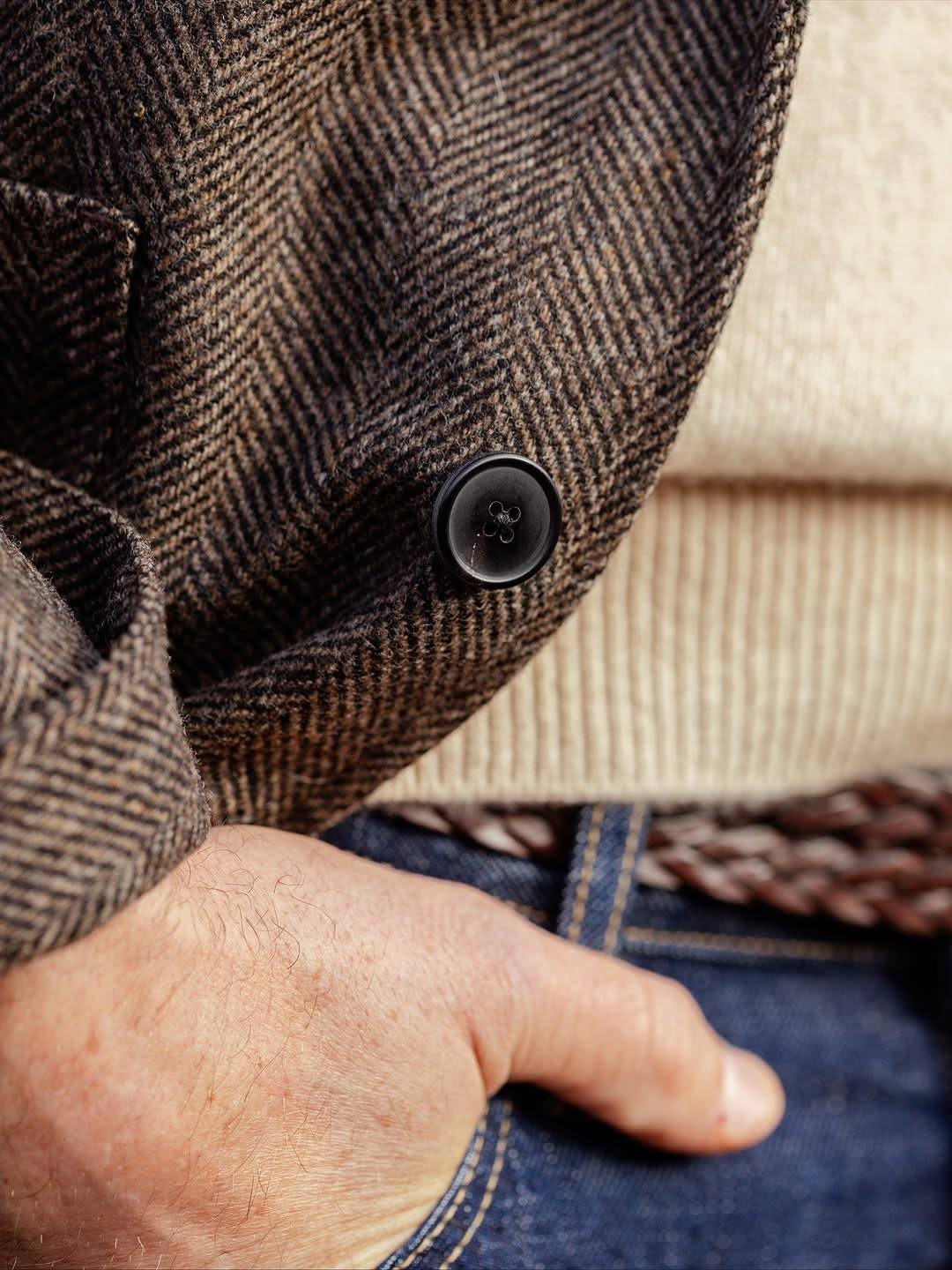- 主要面料:羊毛斜纹布(wool herringbone tweed)。图像中夹克的纹理清晰显示为经典“人字纹”(herringbone)图案,这是一种传统斜纹织法,由细斜线交织形成鱼骨状效果,提供独特的视觉深度和光影变化。
